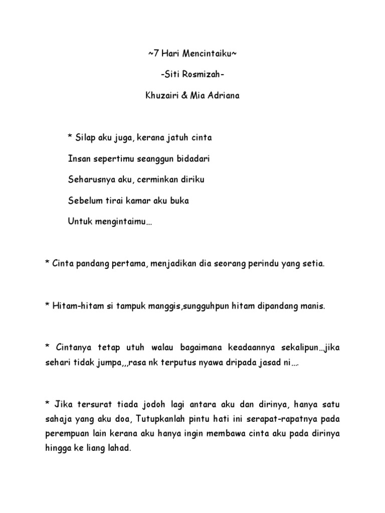 7 Hari Mencintaiku 2 Novel Adaptasi 7 Hari Mencintaiku 2 Novel Adaptasi Save RM598. Khuzairi dalam diam mencintai gadis bernama Mia Adriana. Memang menyirap hati terbakar bila baca.
